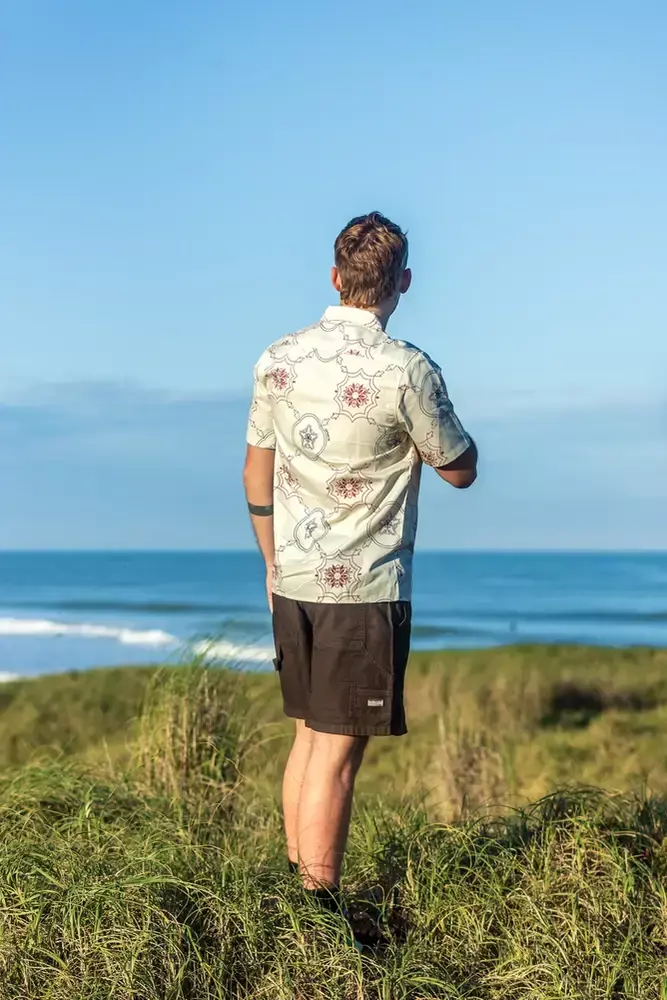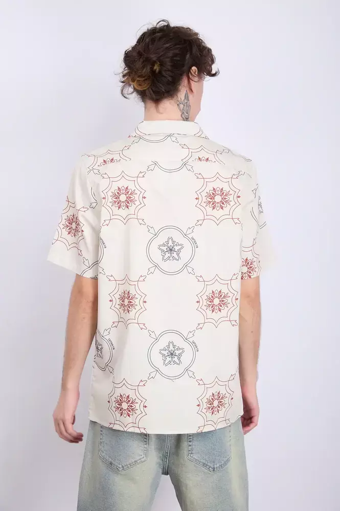 CAMISA FULL PRINT DE GABARDINA LIVIANA COMPOSICIÓN: 100% ALGODÓN. BOTONES SIMIL CAREY PERSONALIZADOS Y ETIQUETA TEJIDA DE MARCA EN EL LATERAL INFERIOR.
